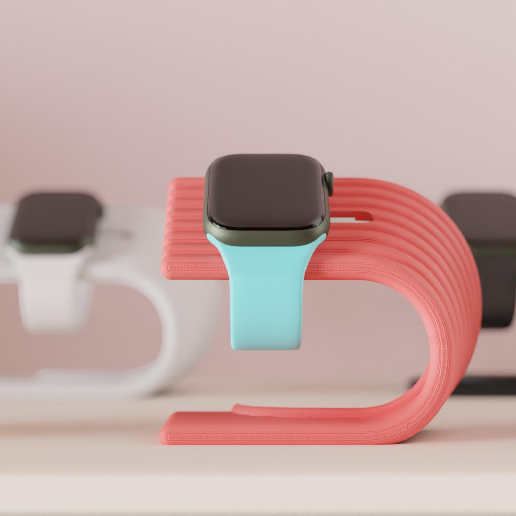 This modern Apple Watch charging stand combines elegant design with practical function, creating a tidy charging area on your desk, sideboard, or nightstand. Its flowing form has a high-quality, minimalist look and fits perfectly into a stylish Apple Watch setup.