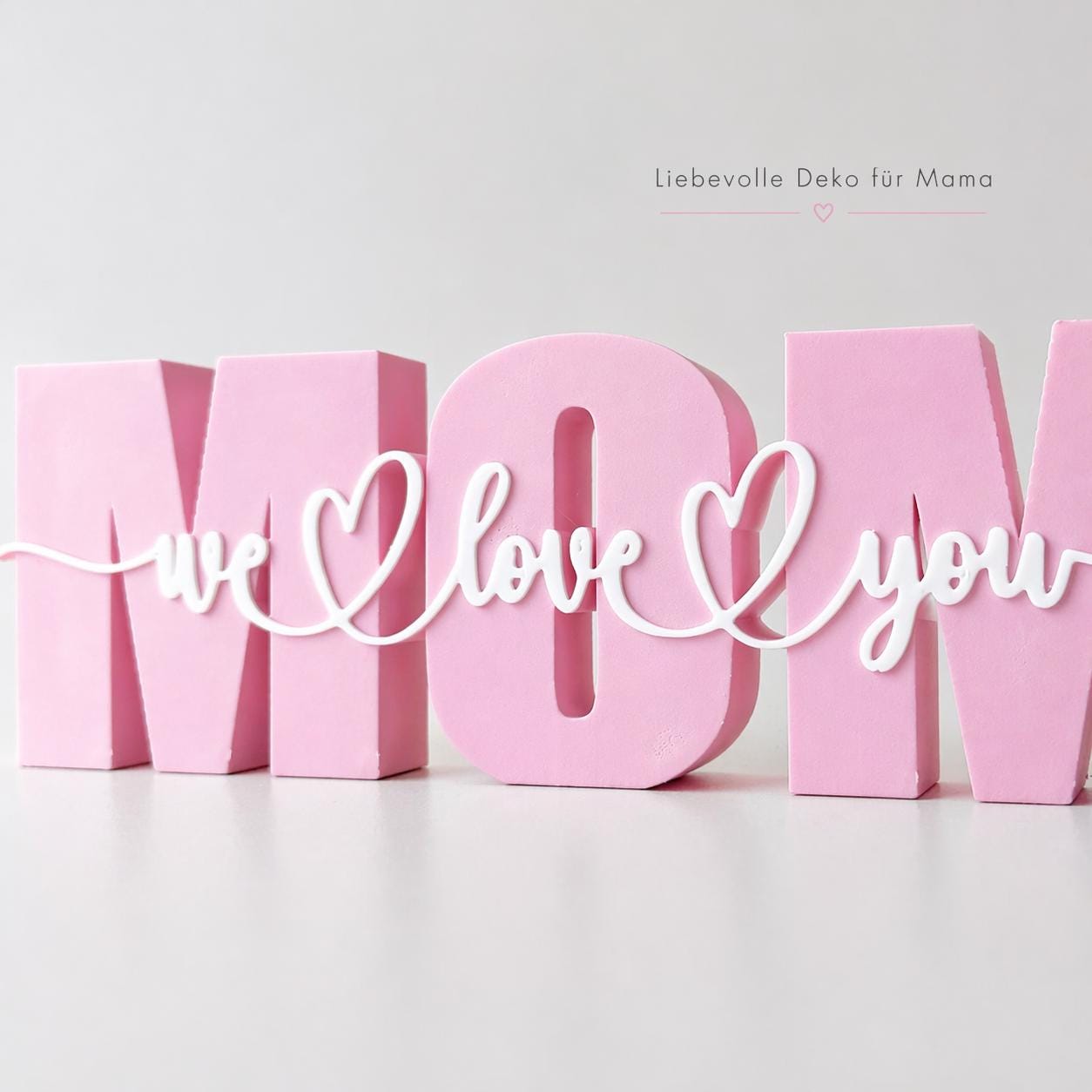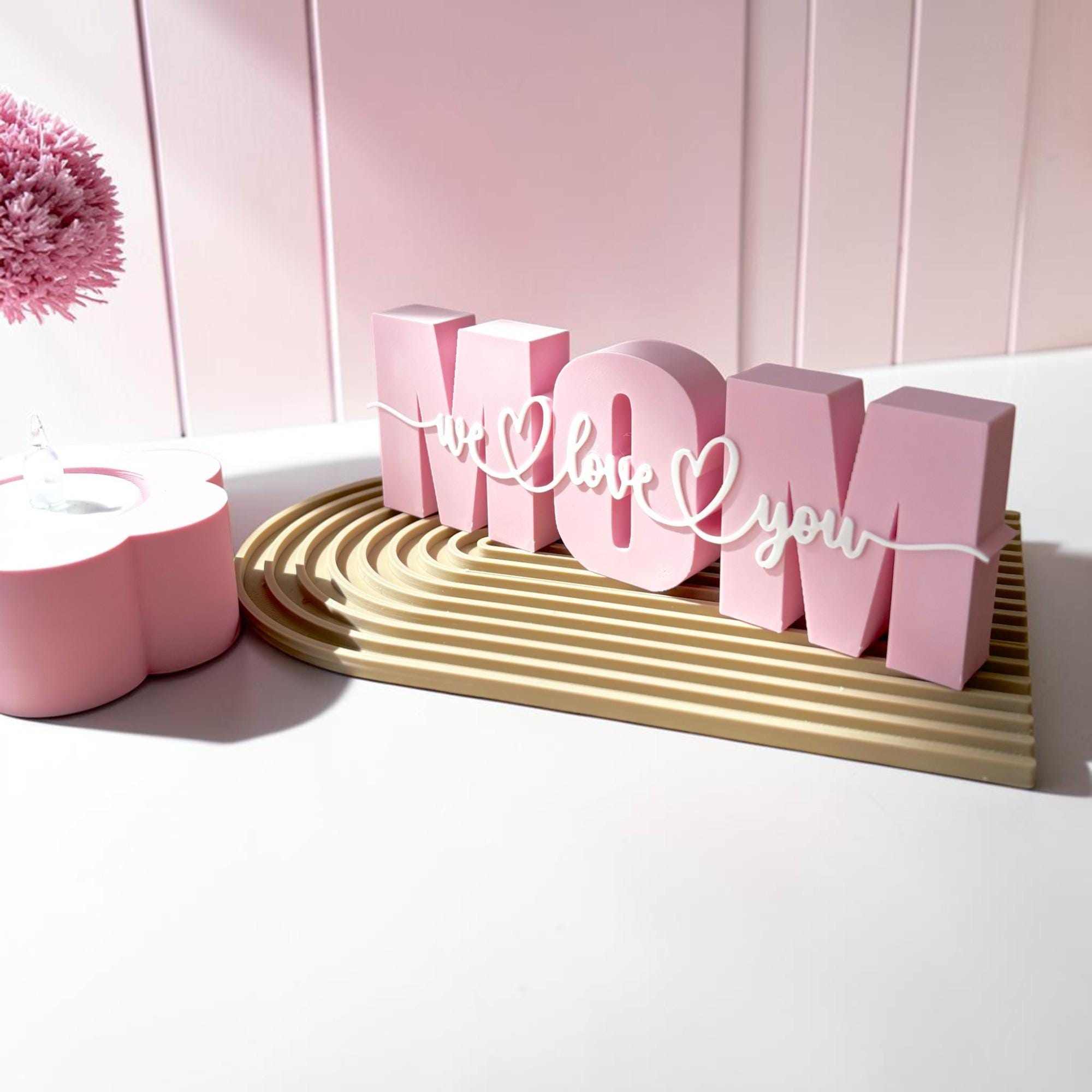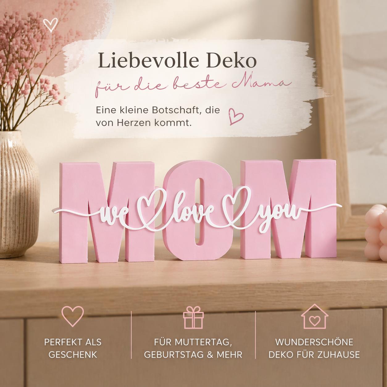 MOM Tischdeko in Rosa mit „we love you“ Schriftzug – eine liebevolle Deko für Mama, Muttertag, Geburtstag oder als kleines Dankeschön.