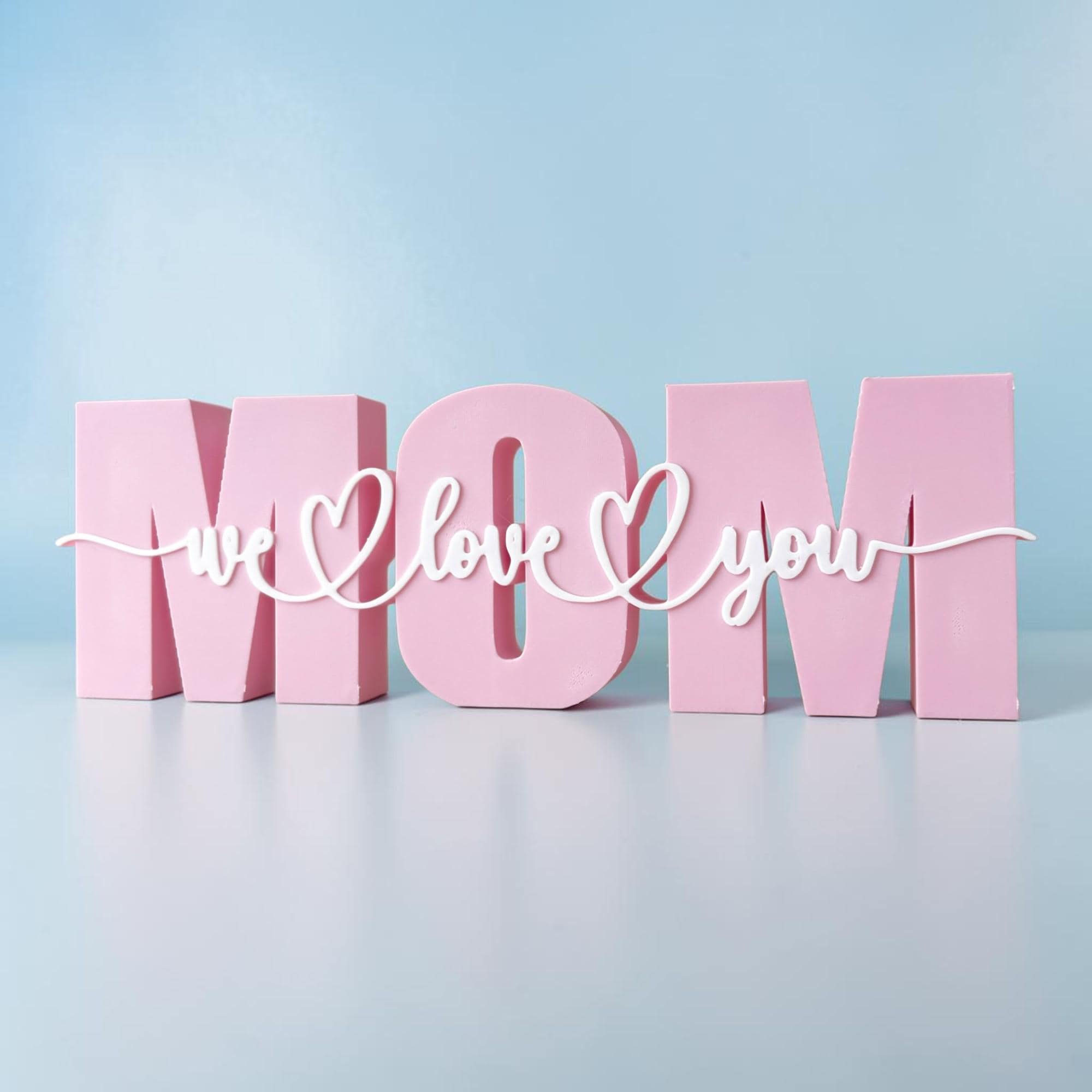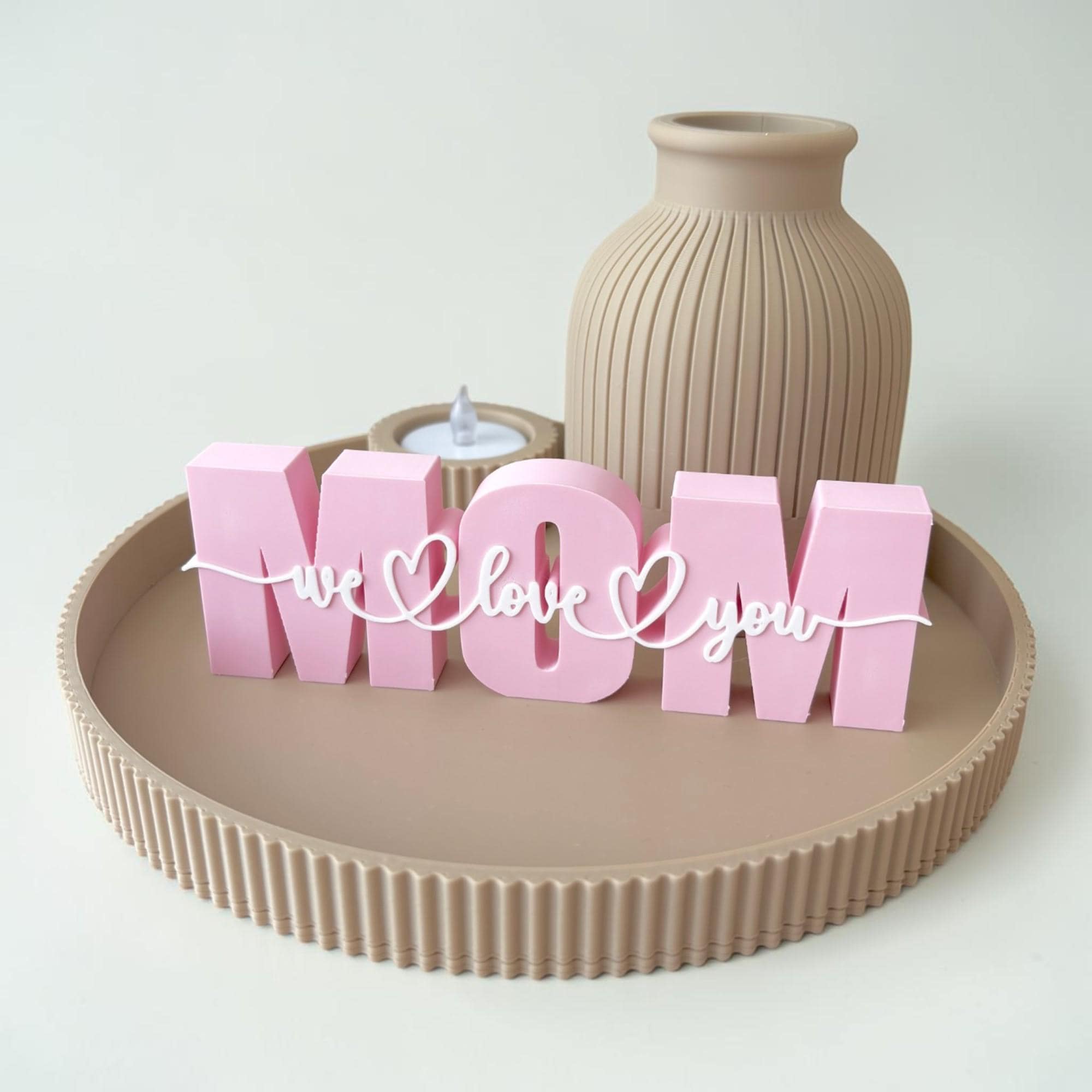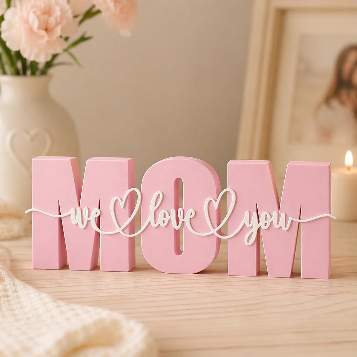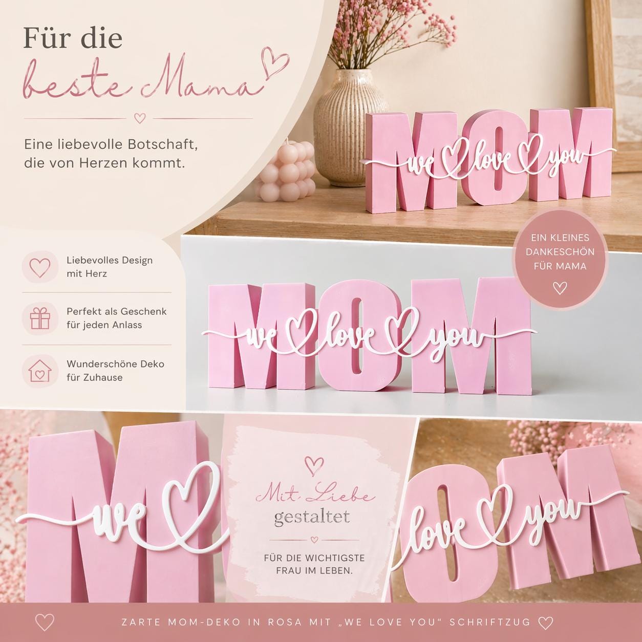MOM Tischdeko in Rosa mit „we love you“ Schriftzug – eine liebevolle Deko für Mama, Muttertag, Geburtstag oder als kleines Dankeschön.