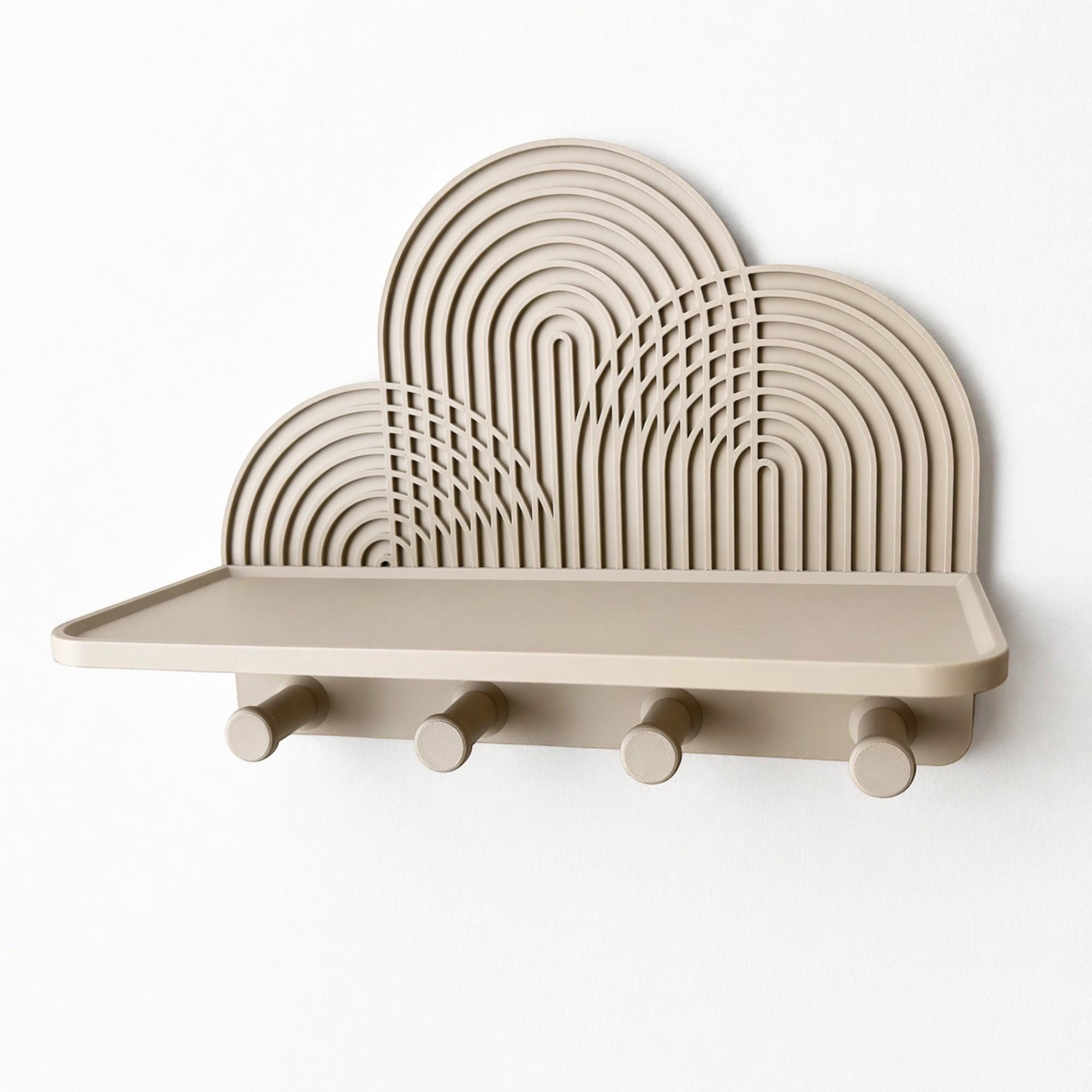 Dieses Wandregal mit strukturierter Kurvenform verbindet praktische Aufbewahrung mit ruhiger Licht- und Schattenwirkung für Flur, Wohnraum oder Büro.