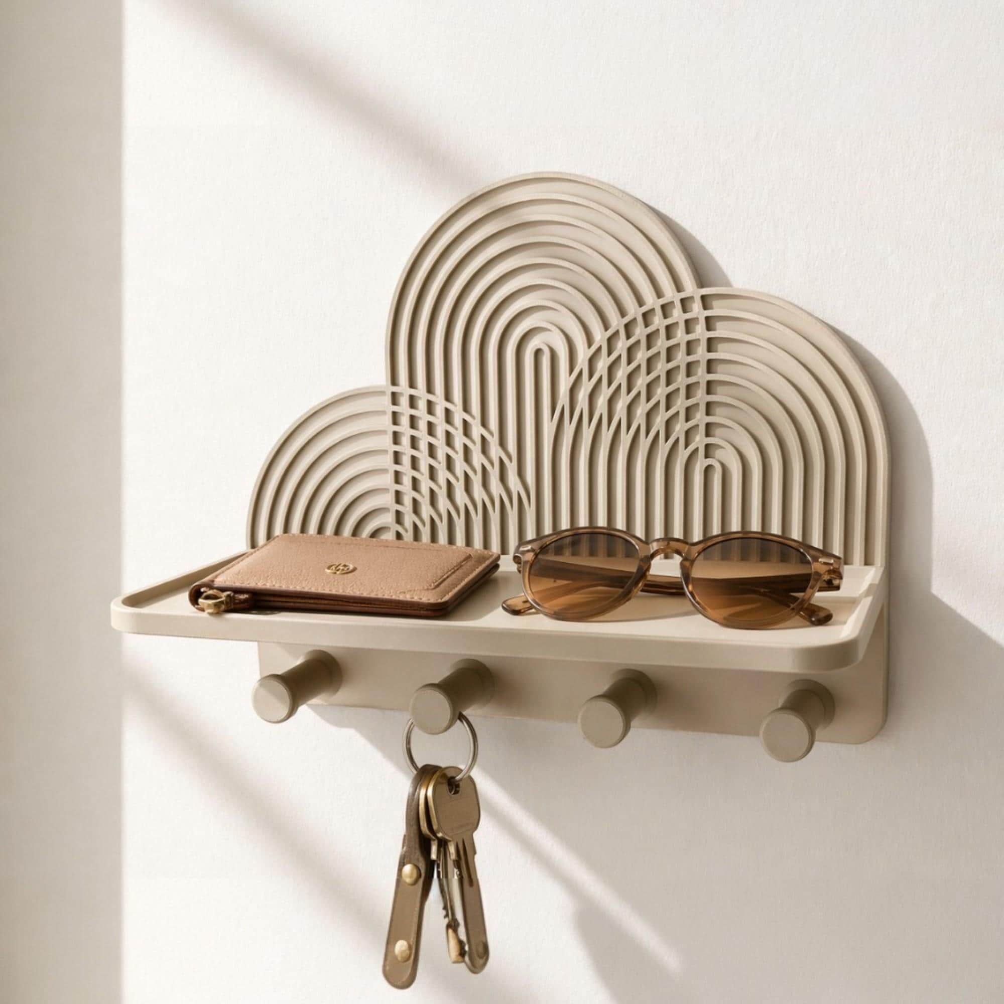 Das Designregal eignet sich ideal für Schlüssel, Brille, Schmuck, kleine Deko oder andere leichte Alltagsgegenstände. Die sanft verlaufenden Kurven erzeugen je nach Tageslicht ein dezentes Spiel aus Struktur, Schatten und Tiefe.