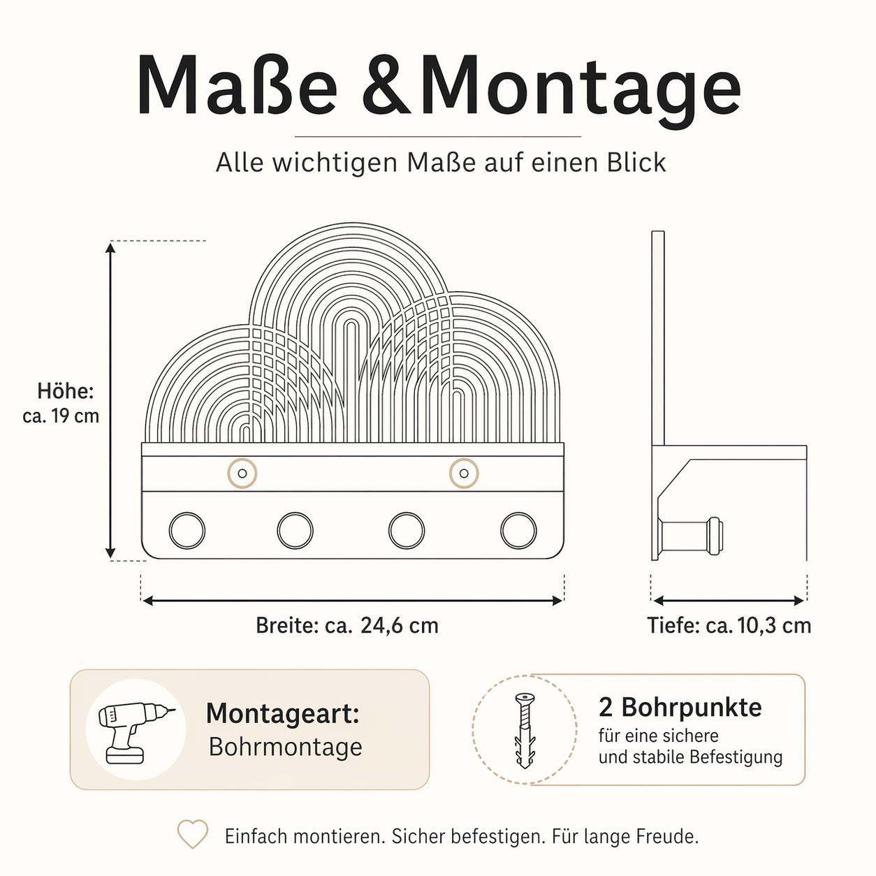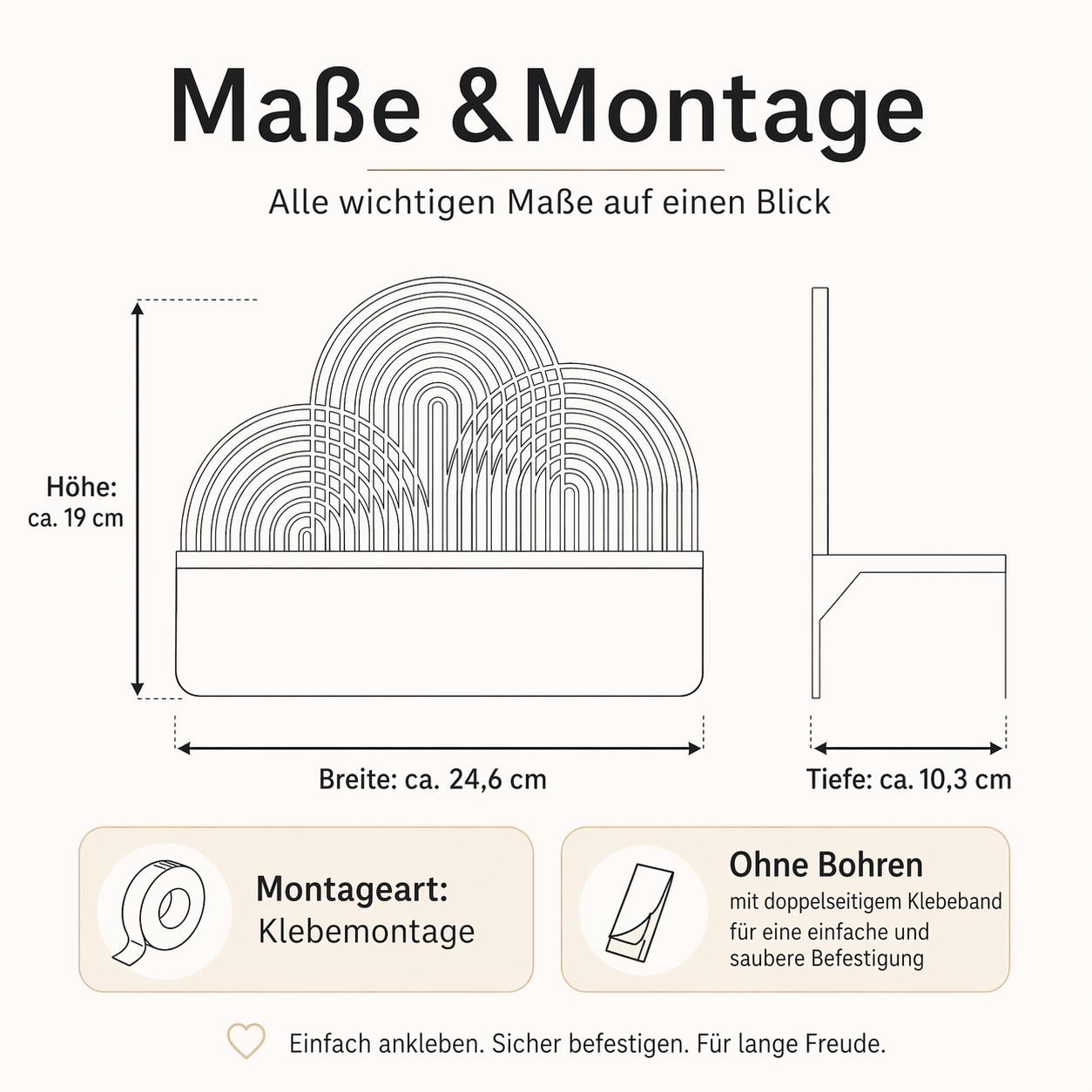 Die stufenweise verlaufenden Kurven erinnern an Wellen der Zeit und lassen das Regal je nach Lichteinfall immer wieder anders wirken. Morgens erscheinen die Schatten weich und leicht, mittags klar und grafisch, abends tiefer und ruhiger. So wird das Regal nicht nur zur Ablage, sondern zu einem dezenten Wandobjekt, das Licht, Struktur und Funktion verbindet.